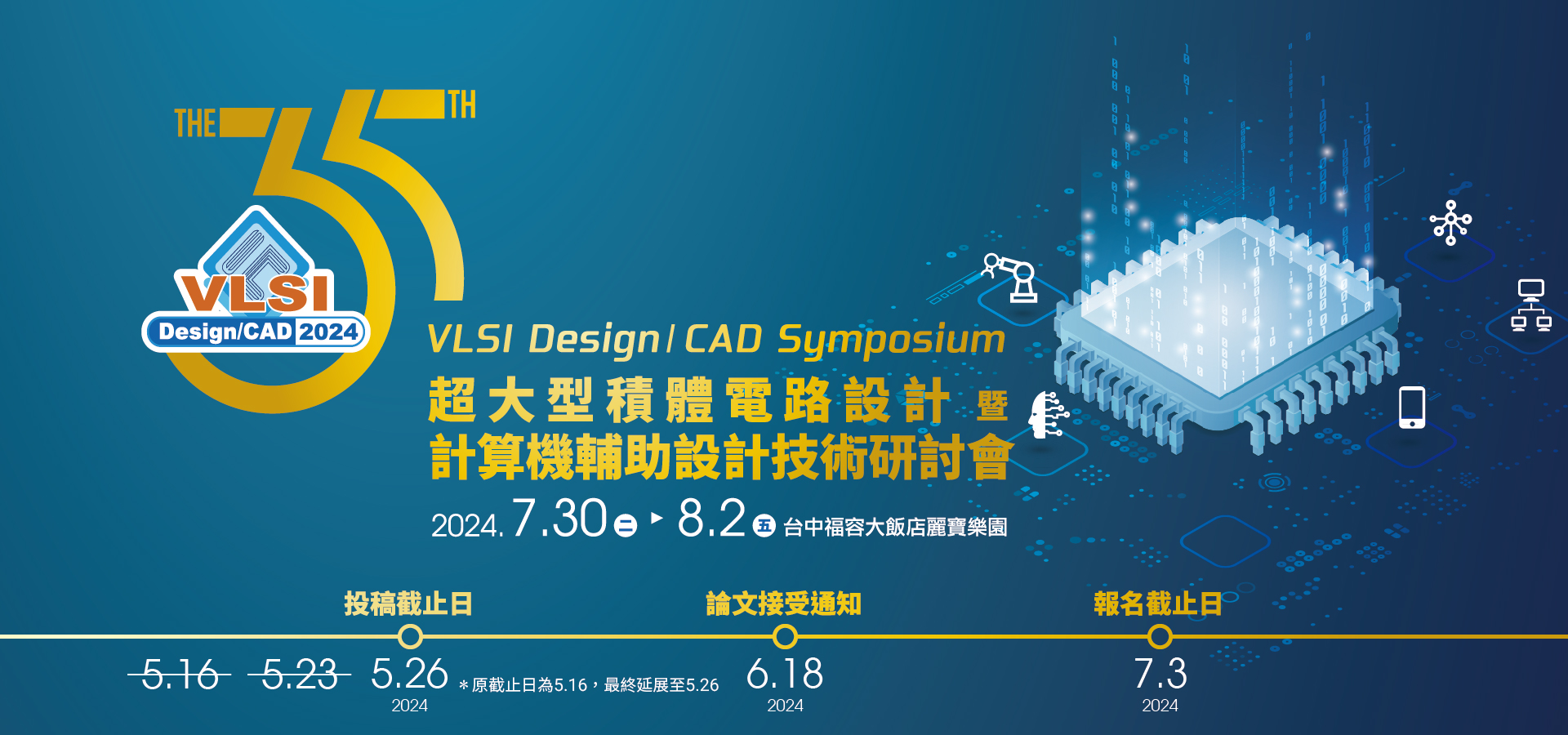 第35屆超大型積體電路設計暨計算機輔助設計技術研討會(VLSI Design/CAD Symposium) 謹訂於2024年7月30日至2024年8月2日假台中福容大飯店 麗寶樂園舉行。本屆大會主題為「Data-centric Paradigm」,依研究主題分為四大領域24個子領域,公開徵求各界稿件。除了口頭/海報論文發表及短期課程外,大會將邀請多位產學界菁英聚焦於Data-Centric運算之智慧應用與創新技術進行專題演講。同時亦安排一系列前瞻設計與技術論壇、學術與職涯規劃座談會及各項動態展示等活動。